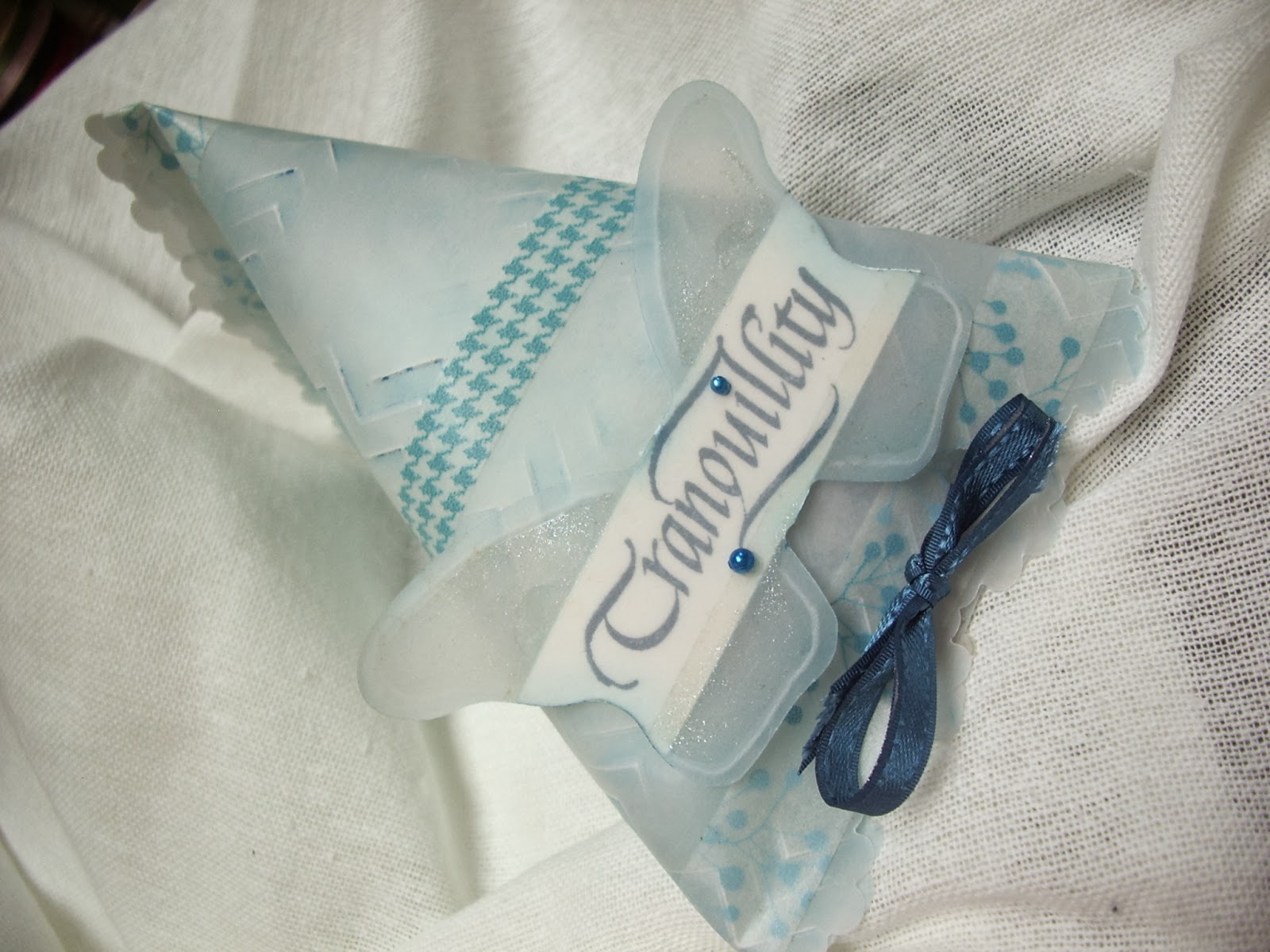 The Labels were die cut (heart - Memory Box, butterfly -Cheery Lynne) and stamped using Stazon with Six Gentle Word's Tranquility from Quietfire Design and embellished.